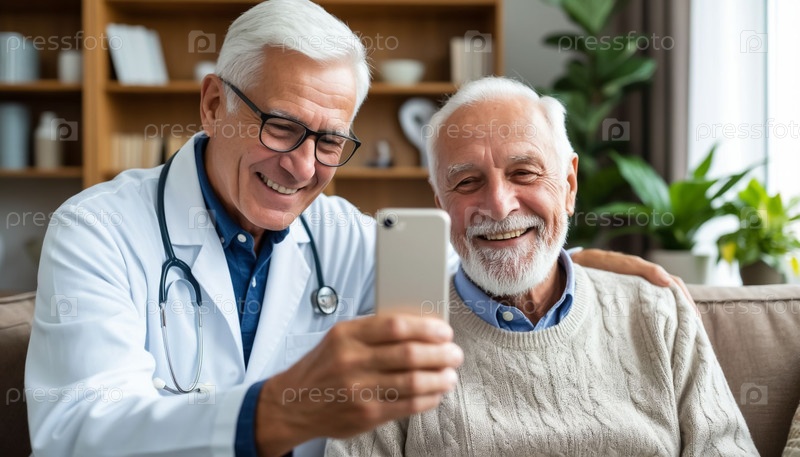Пожилой пациент делает радостное селфи с врачом в клинике