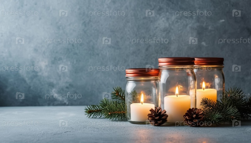Рождественский фон с каменными банками, освещенными фейрическими огнями и чистым пространством для вашего текста на боковой стороне, идеально подходит для праздничного маркетинга