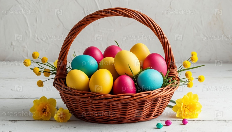 Корзина с окрашенными пасхальными яйцами, красочная праздничная традиция
