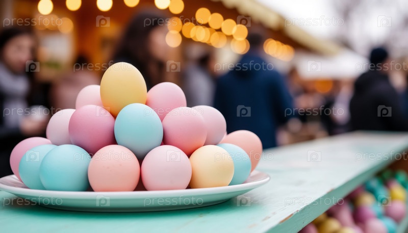 Стол на пасхальном рынке, демонстрирующий красочные пастельные радужные яйца