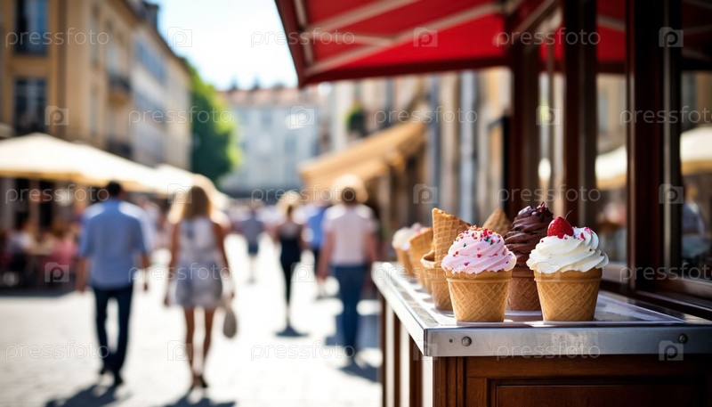 Городская летняя жара с мороженым стоит на переднем плане, освежающее угощение