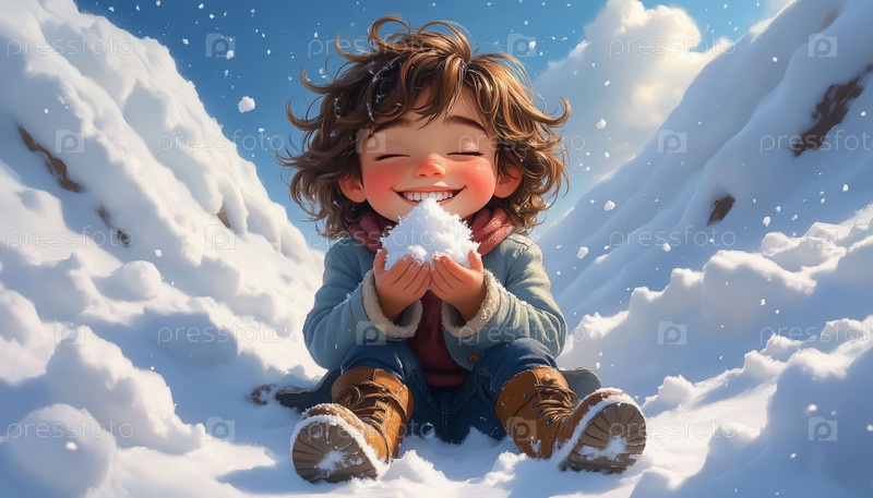 Зимняя мультфильмовая сцена с радостным мальчиком, играющим в снежном дрейфе, иллюстрация детской книги
