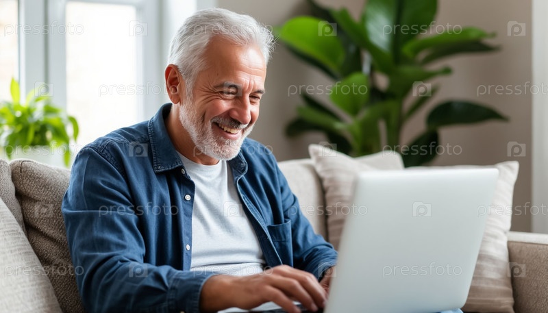 Уверенный старший мужчина Работает на ноутбуке дома Расслабляясь в гостиной