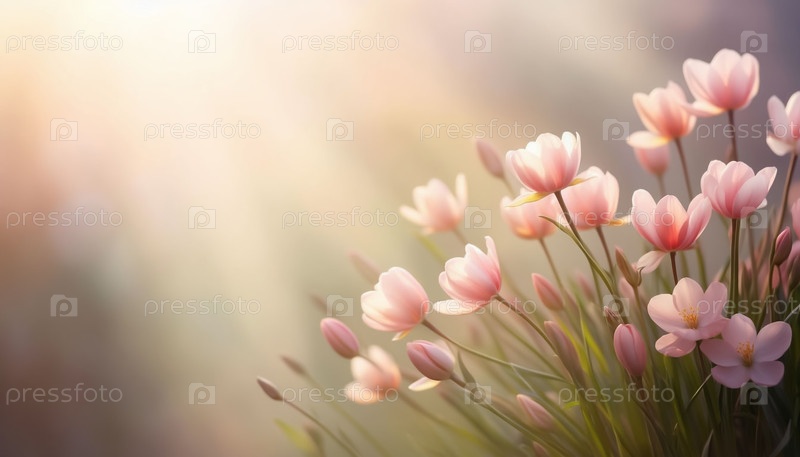 Сцена весеннего утра с розовыми тюльпанами на открытом поле