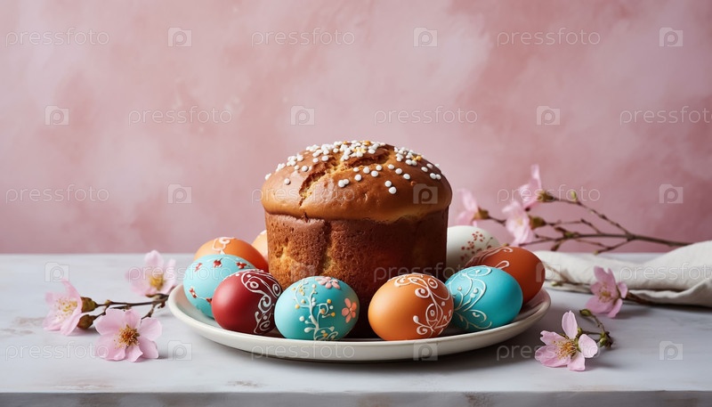 Пасхальный торт Кулича и украшенные яйца на пастельном розовом фоне Цветовая страница
