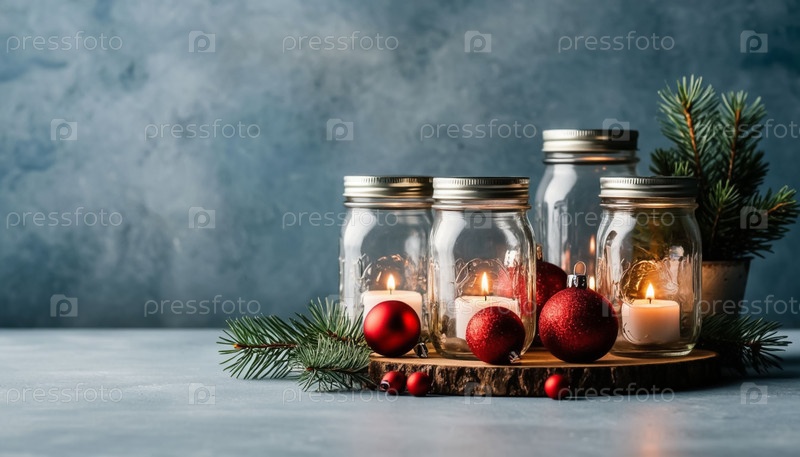 Красочный радужный праздничный фон на Рождество и Новый год с освещенными украшениями из масонских банок, идеально подходит для социальных сетей с текстовым пространством