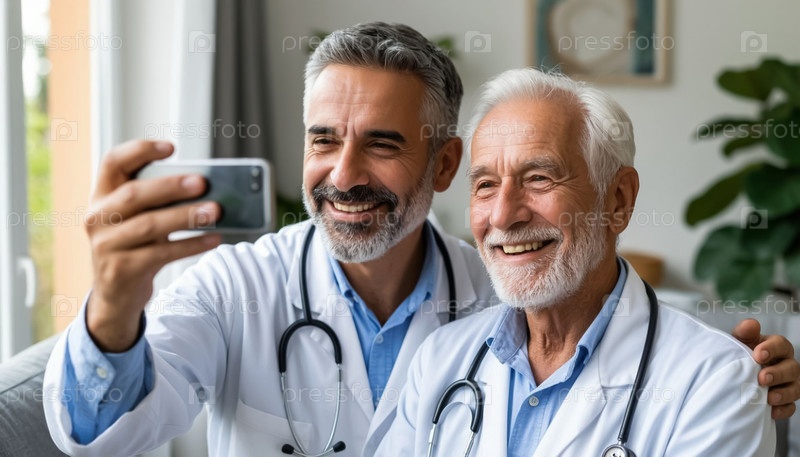 Два пожилых врача-мужчины в белом пальто счастливо делают селфи