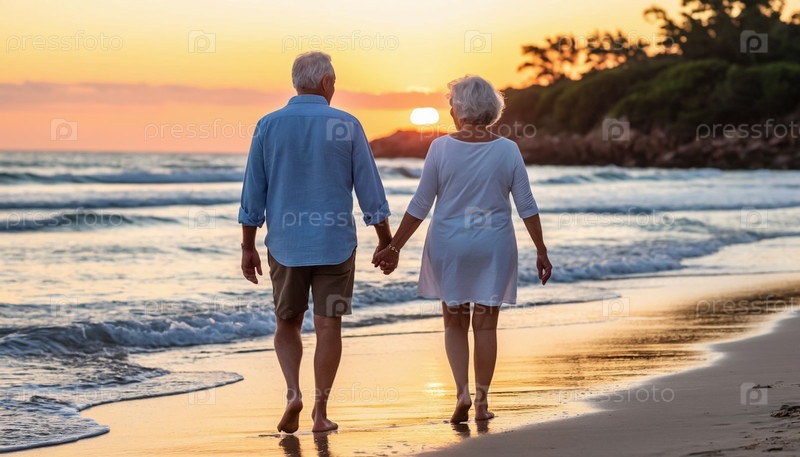 Зрелая пара, идущая рука об руку на береговом побережье в сумерки