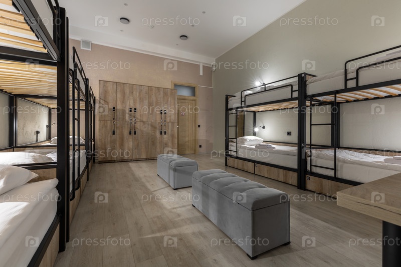 Широкоугольный вид современного общежития хостела с черными металлическими двухместными кроватьми с индивидуальным освещением для чтения.Комната включает в себя большую стену деревянных шкафов, серые обернутые ottomans и чистый ламинированный пол.Функцион