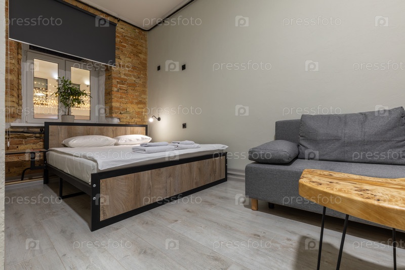 Современный частный номер в общежитии с двуспальной кроватью с деревянной головкой, серым диваном и кофейным столом из натурального дерева
