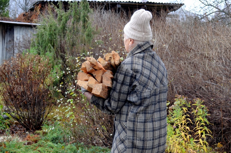 Охапка дров в руках пожилого человека