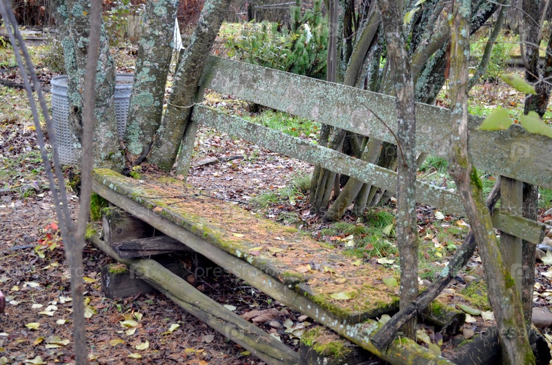 Осенний пейзаж.Старая, замшелая скамейка, засыпанная опавшей листвой