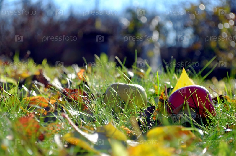 Осенний пейзаж. Яблоки на лужайке с осенними листьями
