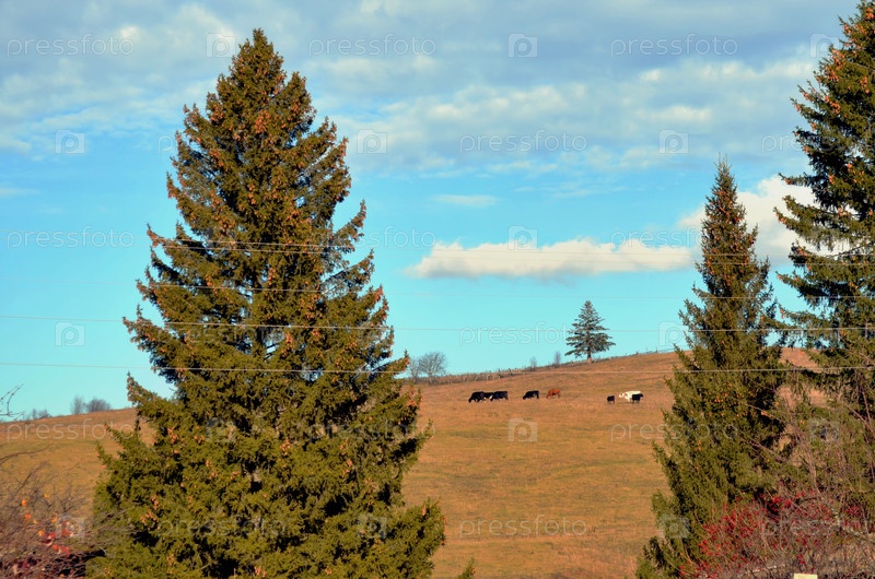 Осенний пейзаж, коровы вдалеке на выпасе