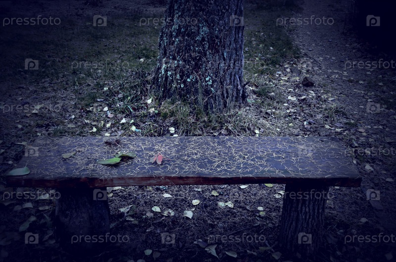 Осенний пейзаж. Старая скамейка, засыпанная опавшей листвой ночью