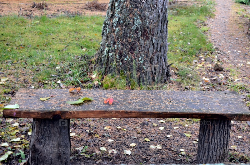 Осенний пейзаж. Старая скамейка, засыпанная опавшей листвой