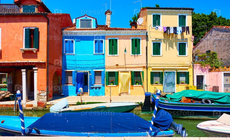Уютные красочные дома и канал с лодками в Бурано