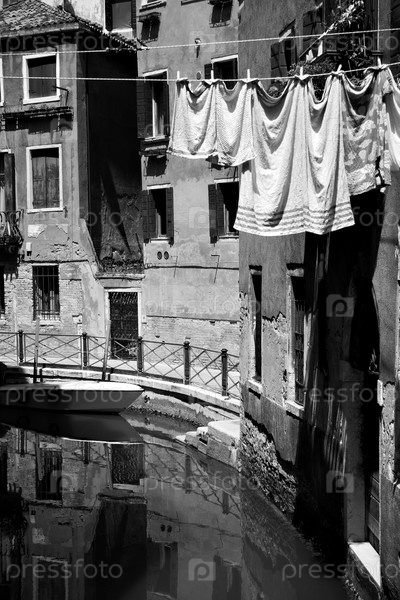 Канал в Венеции со старыми домами и проветривающимся бельем