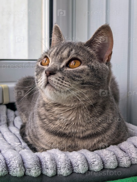 Спокойный серый кот отдыхает на уютном одеяле возле окна