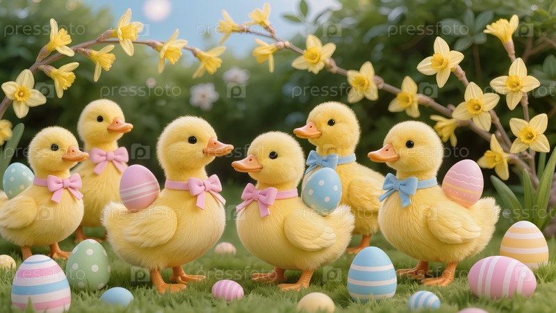 Милые желтые утятки с луками на шее среди красочных пасхальных яиц