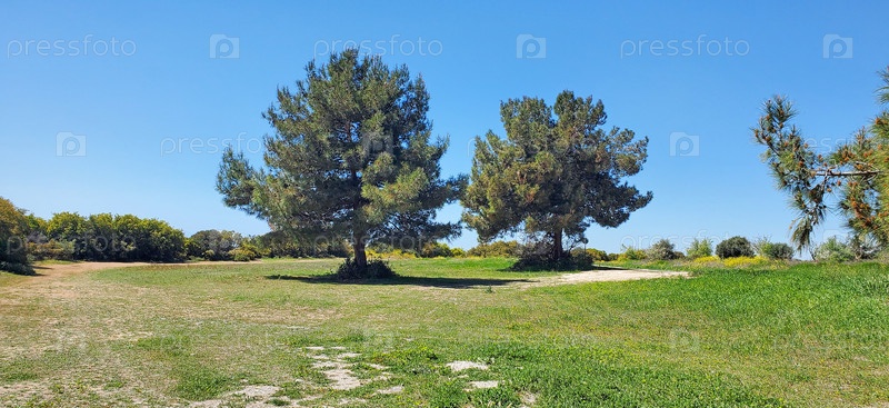 Два больших дерева на зеленой лужайке против чистого синего неба. красота в природе. одинокие деревья обеспечивают спасательную тень в жаркий летний день