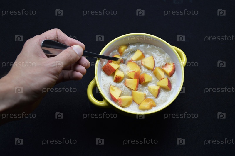 Овсянка, приготовленная в молоке с кусками спелого персика в миске на черном фоне. вкусная и здоровая пища для детей и взрослых. витамины из всех свежих фруктов и клетчатки в каше. диетическая еда