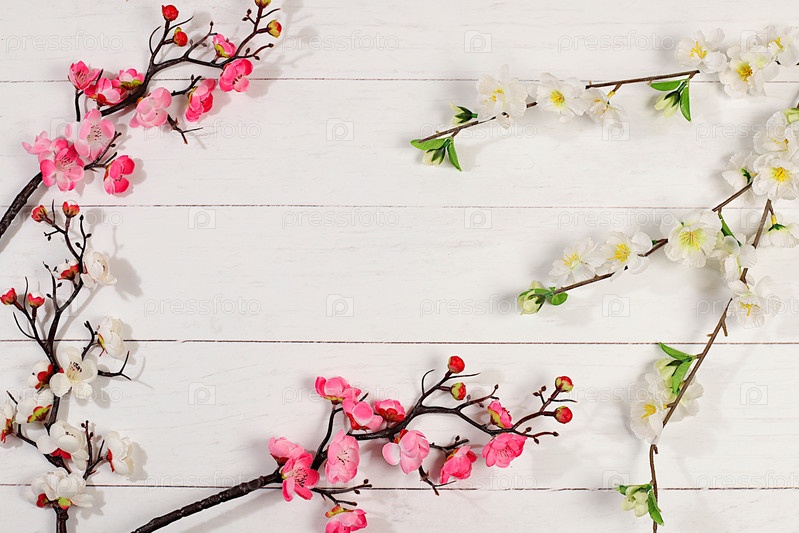 Абстрактные весенние цветочные аранжировки, натюрморт с красивыми цветящими ветвями вишневых цветов и экранированный баннер со свободным местом для текста