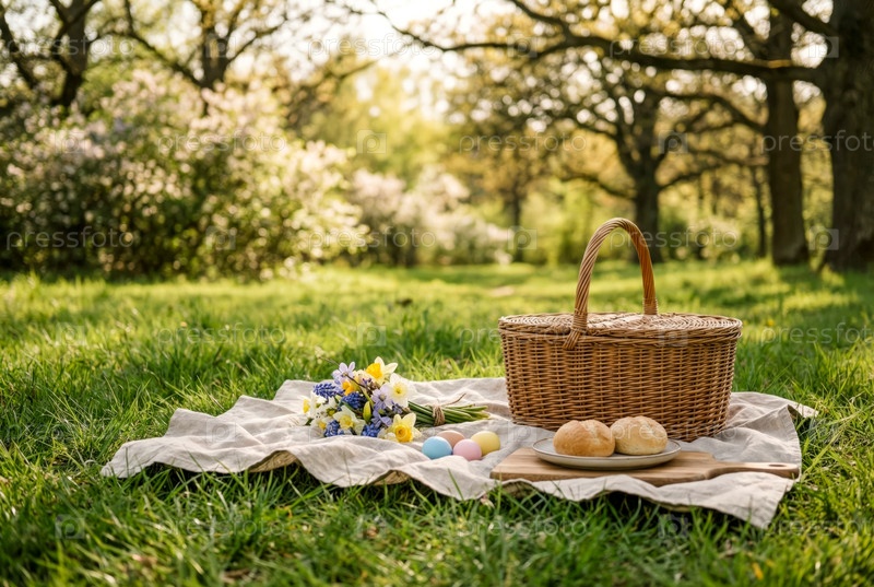 Настройка пикника с корзиной, пасхальными яйцами и цветами на траве