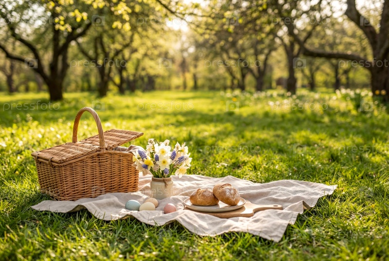 Настройка пикника с корзиной, пасхальными яйцами и цветами на траве