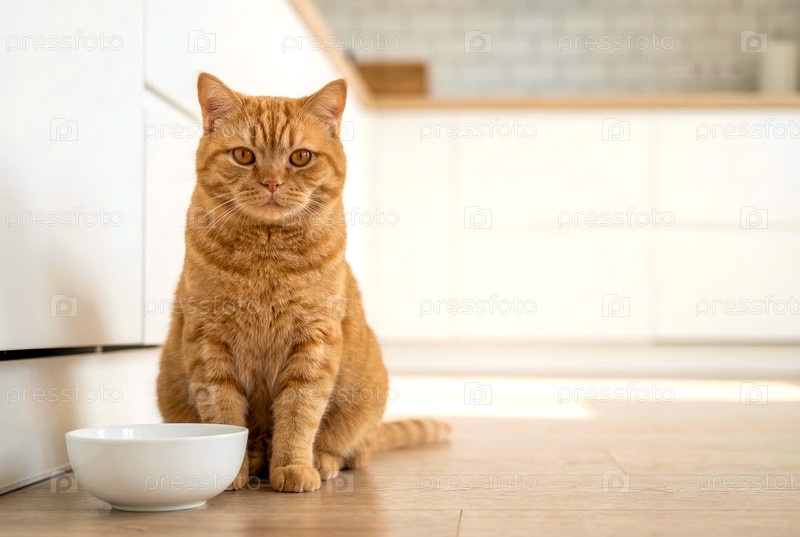 Имбирная кошка, сидящая рядом с пустой миской в яркой кухне