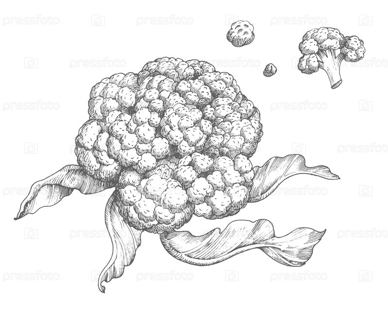 Набор цветной капусты.Векторная чернила в стиле ручной иллюстрации.Для дизайна упаковки, карточек, обложки, печати, этикеток на продуктах и ткани