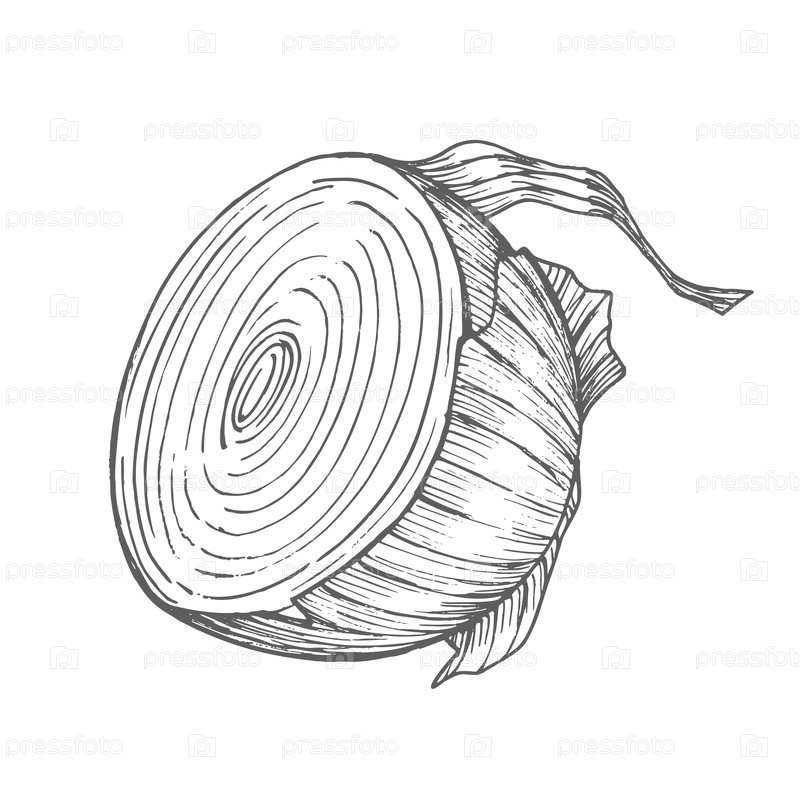 Половина лука.Векторная чернила в стиле ручной иллюстрации.Для дизайна упаковки, карточек, обложки, печати, этикеток на продуктах и ткани