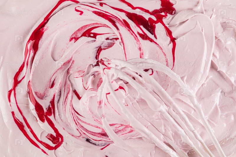 Деликатная текстура ванильной белой смеси с фруктовым вареньем или розовым сиропом. виски для бичевого крема. верхний вид. селективный фокус