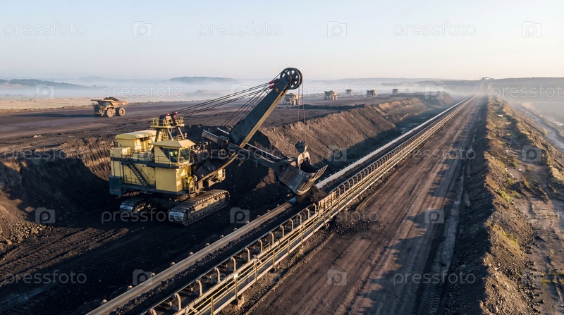 Гигантская электрическая карьерная лопата загружает черный бурый уголь на широкий магистральный ленточный конвейер на фоне большого угольного разреза