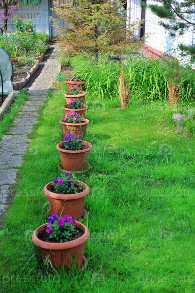Вазоны с цветами на газоне на дачном участке