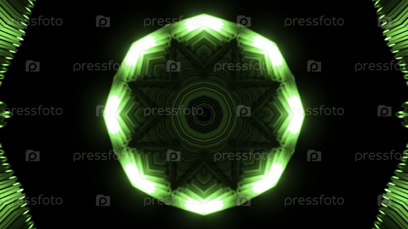 Калейдоскопный фон с фрактальными частями в форме цветка. Дизайн. Пульсирующее движение неоновых фигур