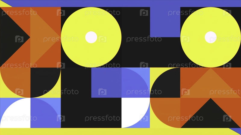 Геометрия в абстракции. Движение. Небольшие разные треугольники круги и квадраты ярко-красных желтых синих зеленых цветов меняются и комбинируются, изменяя свое местоположение и сами формы