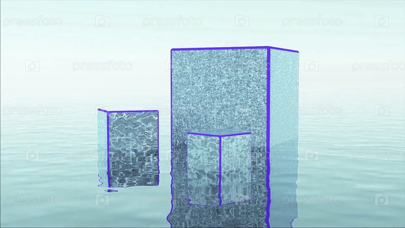 Абстрактный красочный фон с тремя яркими кубами, стоящими на поверхности воды. Дизайн. Синие 3D кубические фигуры с грубой поверхностью в сюрреалистическом ландшафте