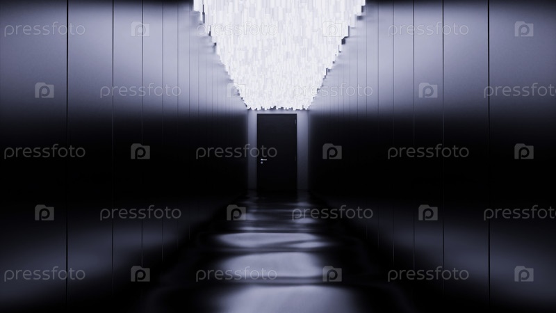 Сон во время сна с темным пугающим сюрреалистическим коридором с дверью в конце. Дизайн. Вид внутрь абстрактного здания