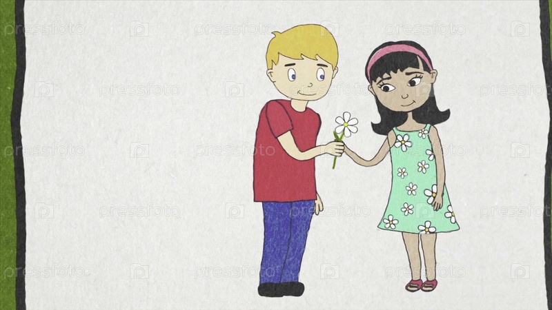 Анимация мультфильма, где мальчик дарит цветок девушке и она целует его в щеку