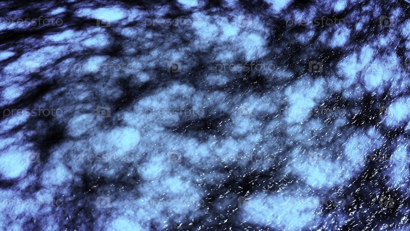 Вид сверху на голубую морщинистую поверхность воды с черными пятнами, бесшовная петля. Анимация. Абстрактное волнистое жидкое вещество, движущееся и протекающее с черной краской или чернилами в нем