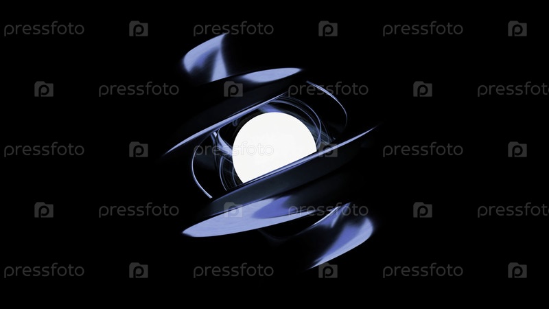 Яркая абстрактная большая металлическая спираль, вращающаяся вокруг белой статической сферы. Aesign. мяч, окруженный крутящимися широкими полосами, изолированными на черном фоне