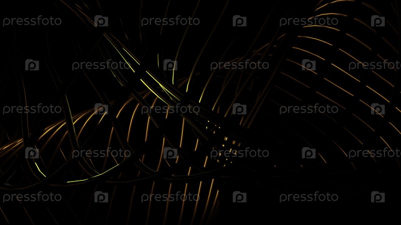 Абстрактные золотистые спиральные элементы, создающие эффект коридора на черном фоне, бесшовная петля. Дизайн. Скрученные оранжевые и желтые 3D-полосы, вращающиеся без конца