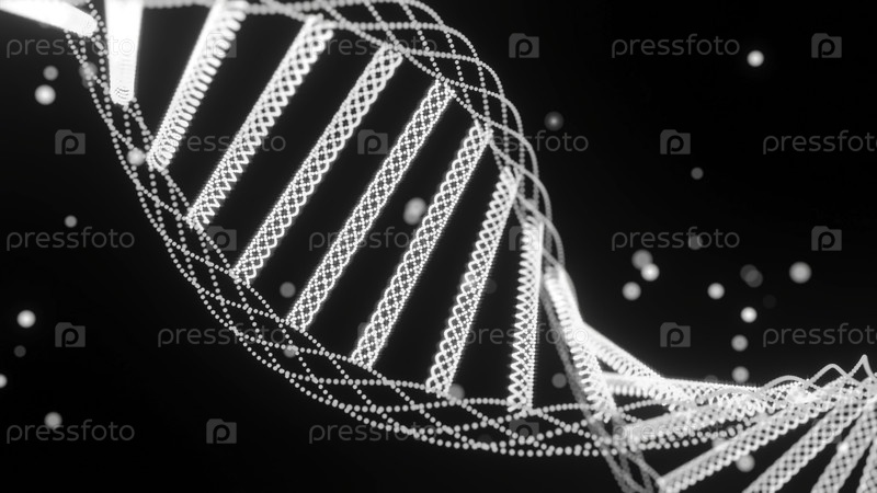 Дизайн. Красивая вращающаяся спираль ДНК с волшебными точками. Светящиеся точки передвигаются вокруг спирали ДНК