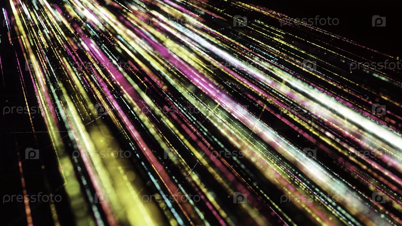 Психоделический поток ярких светящихся линий. Анимация. Ириделевый поток ярких сияющих линий искажается в киберпространстве. Поток многоцветных линий во время прыжка в киберпространстве с психоделическим эффектом