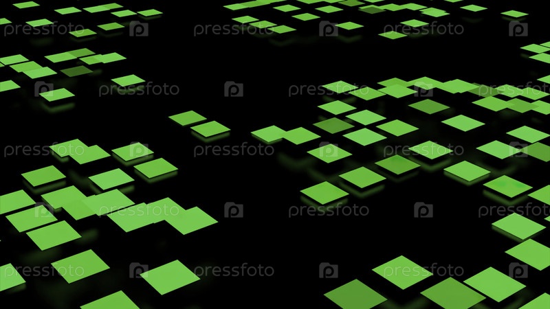 Темный фон.Дизайн.Зеленые яркие квадраты небольшого размера, которые перемещаются и прыгают в абстракции