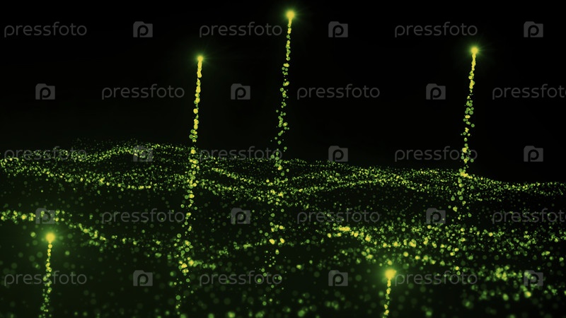 Абстрактное зеленое блестящее футуристическое цифровое пространство с уникальными точками и летающими кометами. Движение. Темно-зеленая волнистая поверхность крошечных частиц