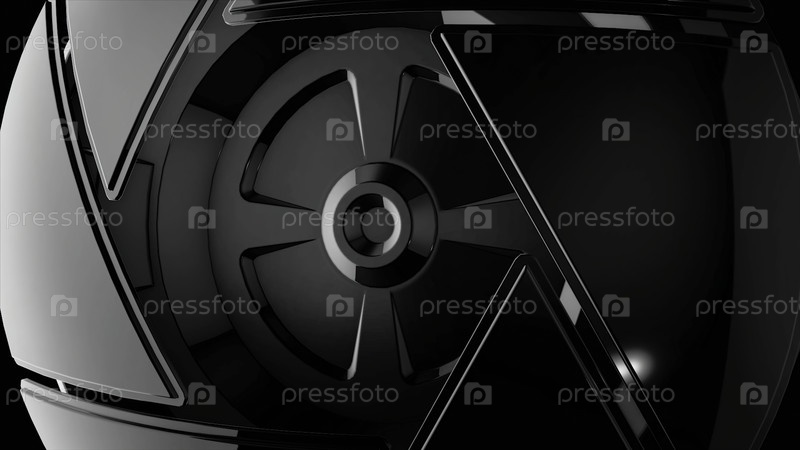 Закрыть для монохромного симметричного круга, геометрически сформированного вращающимися треугольниками, бесшовной петлей. абстрактный механизм, трехконечная форма окружности детального спиннинга, черно-белый