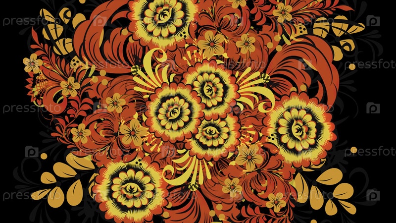 Посудочная живопись Хохлома Россия ярко-красных цветов и ягод на черном фоне