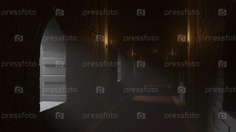Темный средневековый коридор замка с кирпичными каменными стенами и светящимися свечами. дизайн. интерьер замка